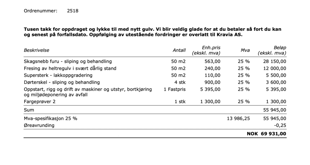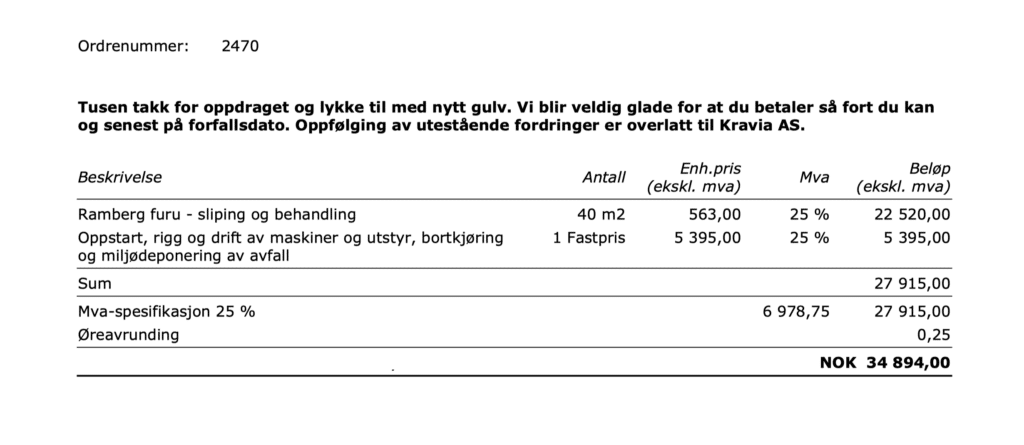 Her er en ekte faktura fra en kunde som har et enkelt prosjekt – 40m2 furugulv som skal slipes og behandles med en hvitpigmentert behandling som gulvsliperiet her har utviklet og makredsfører som en av sine spesielle uttrykk – de kaller den Ramberg. Det er en hvitpigmentert lakkbehandling.